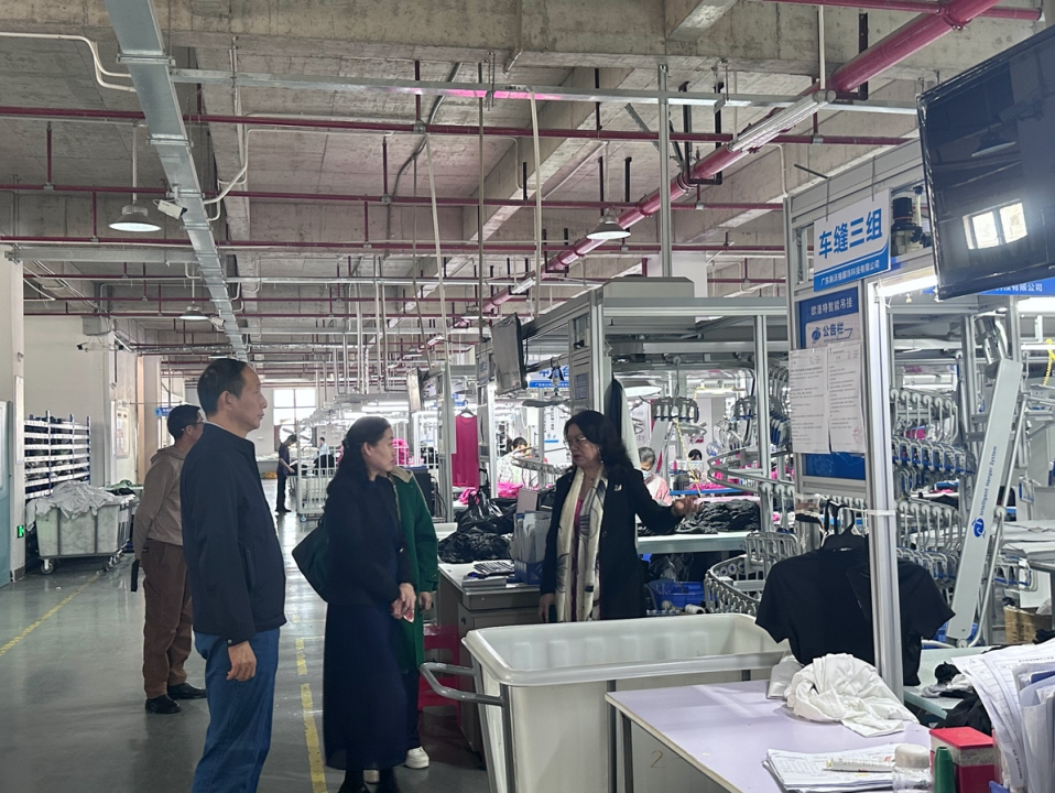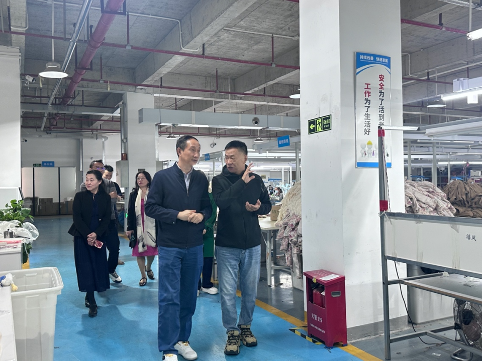 座谈会后,蒋伯杰一行实地考察规划宏伟、建设日新月异的广清中大时尚科技城,走访了数家具有代表性的现代化纺织服装企业。在高度自动化的熨烫车间、车缝车间以及智能成衣制作流水线前,蒋校与随行人员驻足观看,与企业负责人和技术人员深入交流,详细询问设备性能、工艺流程、技术难点及对操作人员的技能要求。大家亲眼目睹了素胚到印花面料、从面料到成衣的现代化生产过程,切身感受到了大数据、物联网、人工智能等新一代信息技术与传统纺织服装产业深度融合带来的革命性变化,对产业升级背景下的人才需求新标准有了更直观、更深刻的认识。