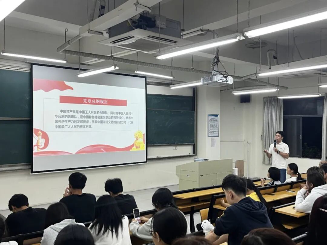 此外,曾世旺老师结合学院党建工作特色与优秀党员事迹,以“身边人讲身边事”的方式,分享了党员在学业科研、志愿服务、社会实践中的责任与担当,鼓励新生们以党员标准严格要求自己,在日常学习中锤炼本领,在服务同学中践行初心,主动向党组织靠拢。