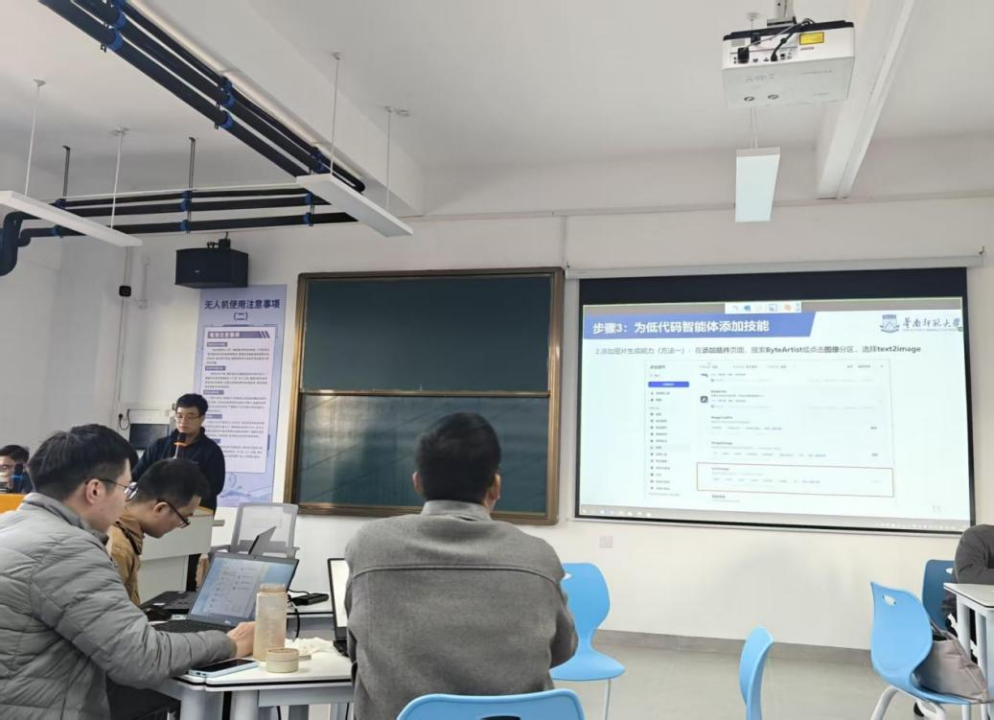 12日下午,培训聚焦“AI辅助教学设计与备课智能体搭建”。吴教授引导教师们运用COZE扣子编程平台,按照“创建智能体—编写提示词—添加技能—调试优化—发布应用”的流程,亲手搭建专属备课智能体。该智能体可实现教案生成、PPT制作、教学图片生成等多功能集成,支持教师根据教学主题和需求,一键获取结构化教案、适配教学场景的PPT课件及教学相关图片,极大提升了备课效率与质量。吴教授还就提示词优化、插件功能拓展、知识库搭建等关键技术点进行细致指导,确保每位教师都能熟练掌握智能体搭建技巧。