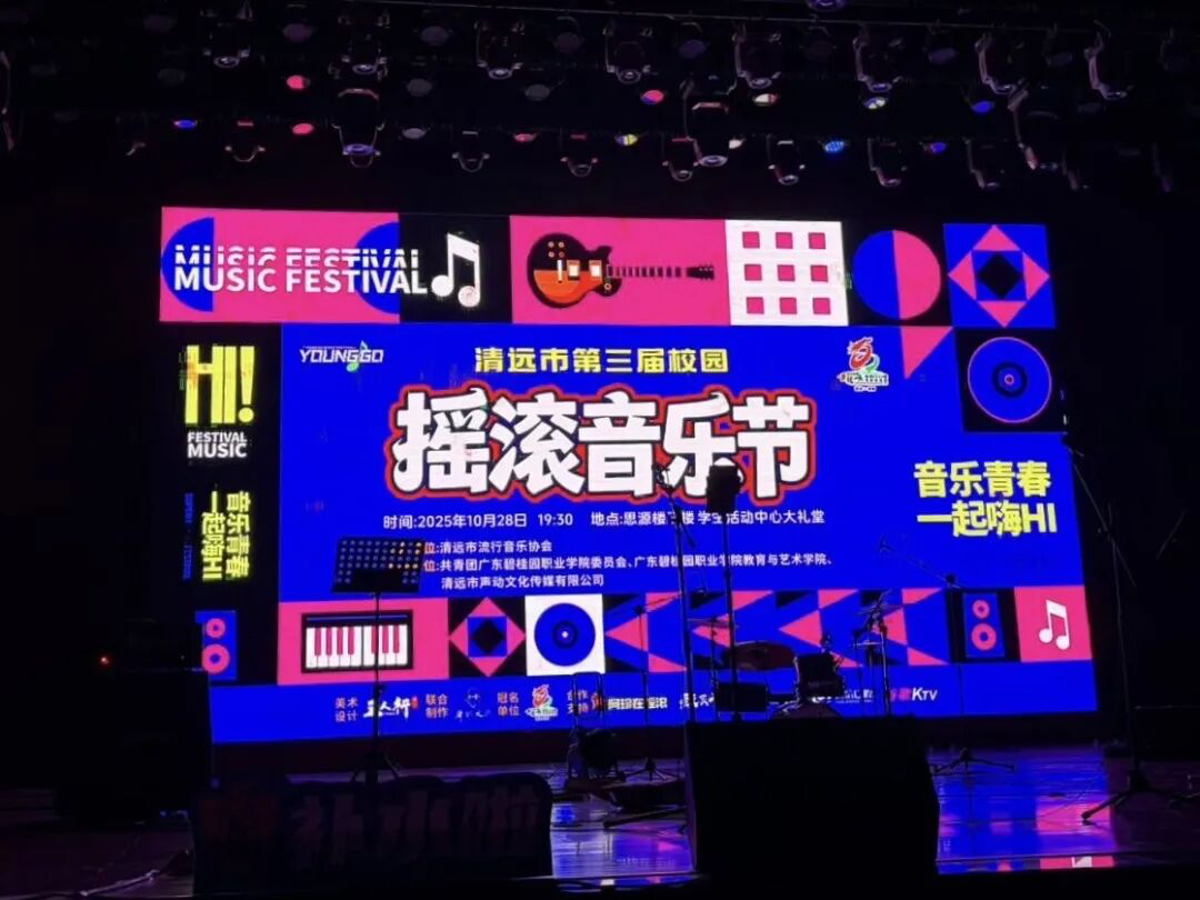 2025年10月28日晚,清远市第三届校园摇滚音乐节在思源楼3楼学生活动中心大礼堂成功举办。本次活动由清远市流行音乐协会主办,共青团广东碧桂园职业学院委员会、教育与艺术学院以及清远市声动文化传媒有限公司联合承办。主要由《破民谣》乐队、《阿珍在摇滚》乐队及学校音乐社钱均晋、黄玉霞、余邦塬、吴彦杰等学生出演。夜幕尚未完全降临,大礼堂内已被沸腾的人声与躁动的乐器前奏填满,荧光棒汇成流动的星河,随着鼓点节奏起伏摇摆。