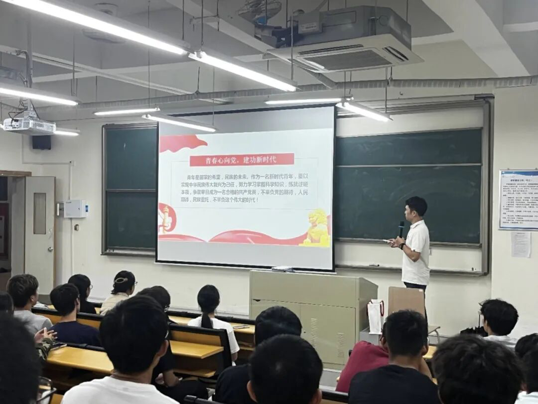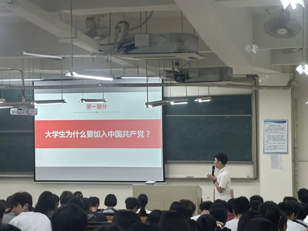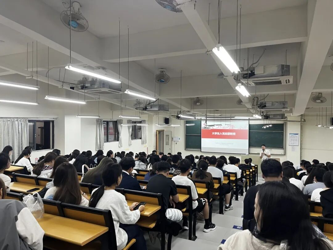 此外,曾世旺老师结合学院党建工作特色与优秀党员事迹,以“身边人讲身边事”的方式,分享了党员在学业科研、志愿服务、社会实践中的责任与担当,鼓励新生们以党员标准严格要求自己,在日常学习中锤炼本领,在服务同学中践行初心,主动向党组织靠拢。