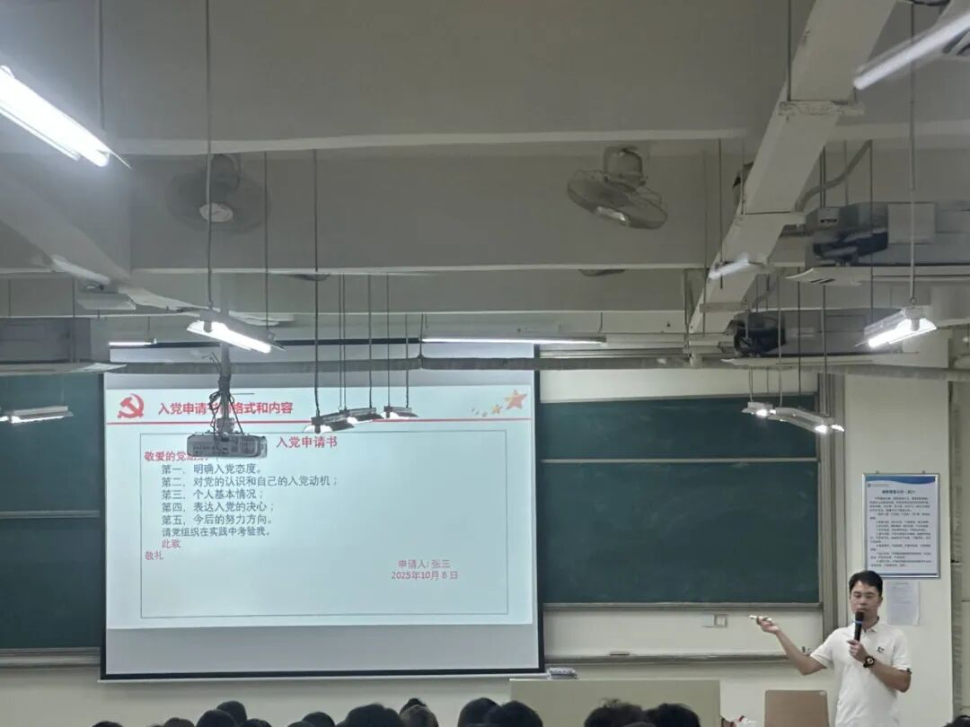 同时,他详细解读了从入党申请到成为正式党员的完整流程,明确了入党申请书撰写的规范要求、思想汇报的核心要点,以及入党过程中需注重的实践积累与品德修养,为新生们指明了清晰的努力方向。