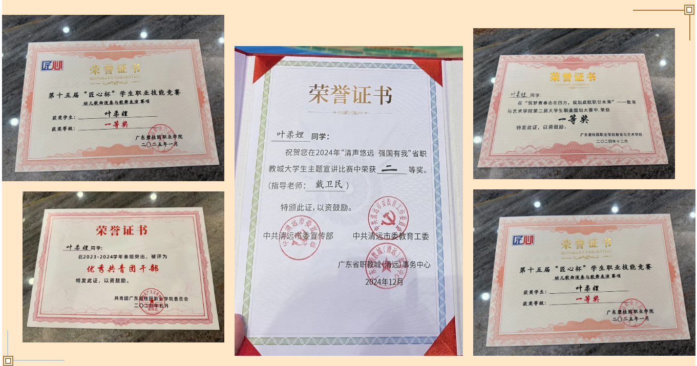 2024年获广东碧桂园职业学院新年音乐会专业组亚军、“优秀共青团干部”、广东省诵写讲大赛校赛二等奖等荣誉;2025年斩获学校第十四届匠心杯学生职业技能大赛幼儿歌曲演奏与歌舞表演一等奖、第十六届匠心杯舞蹈表演赛一等奖,还获评学校“优秀共青团干部”“优秀学生骨干”,并在第四届粤港澳大湾区大学生艺术节摄影比赛等省级赛事中取得优异成绩,同时荣获学校凤凰奖学金三等奖,用实力证明了自身的专业素养。