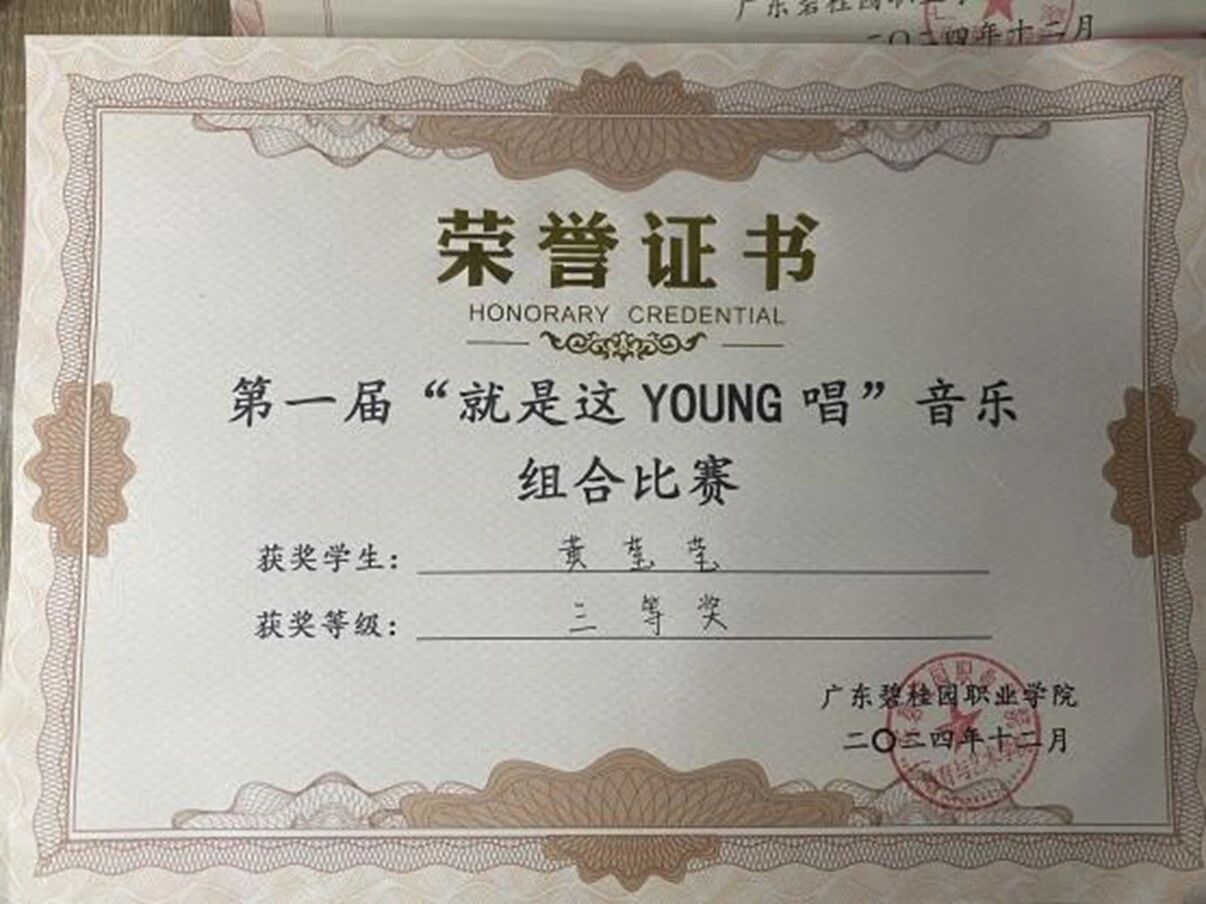 在校期间,黄莹莹的努力与付出也收获了诸多肯定:2023年获评“国防教育学习先进个人”,2024年接连拿下“优秀志愿者”“优秀学生干部”等称号,在参加第一届“就是这YOUNG唱”音乐组合比赛中荣获三等奖,2025年斩获凤凰奖学金三等奖等。